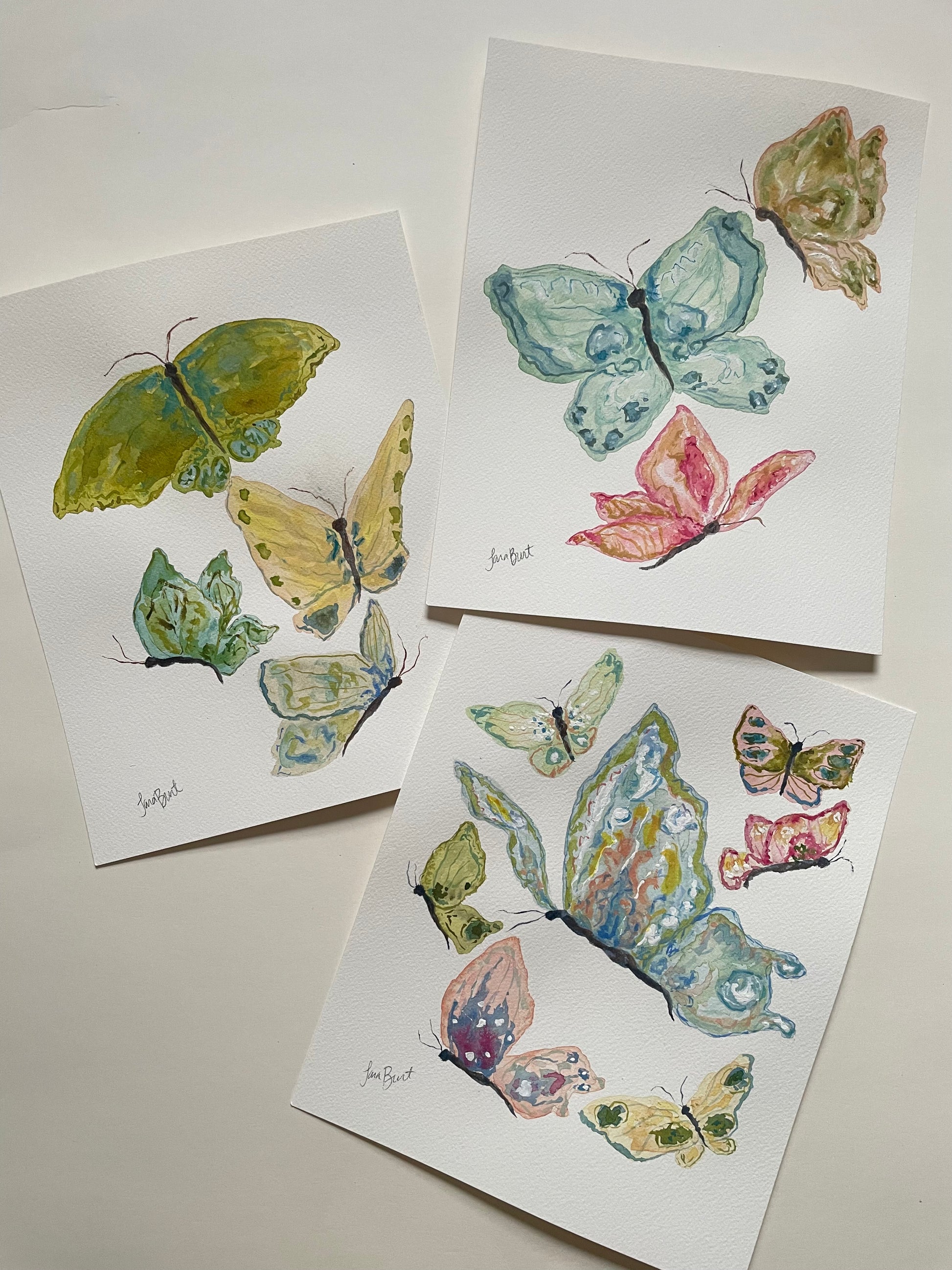 8x10 Whimsical fluttering butterflies on cotton paper in watercolor and gouache mediums