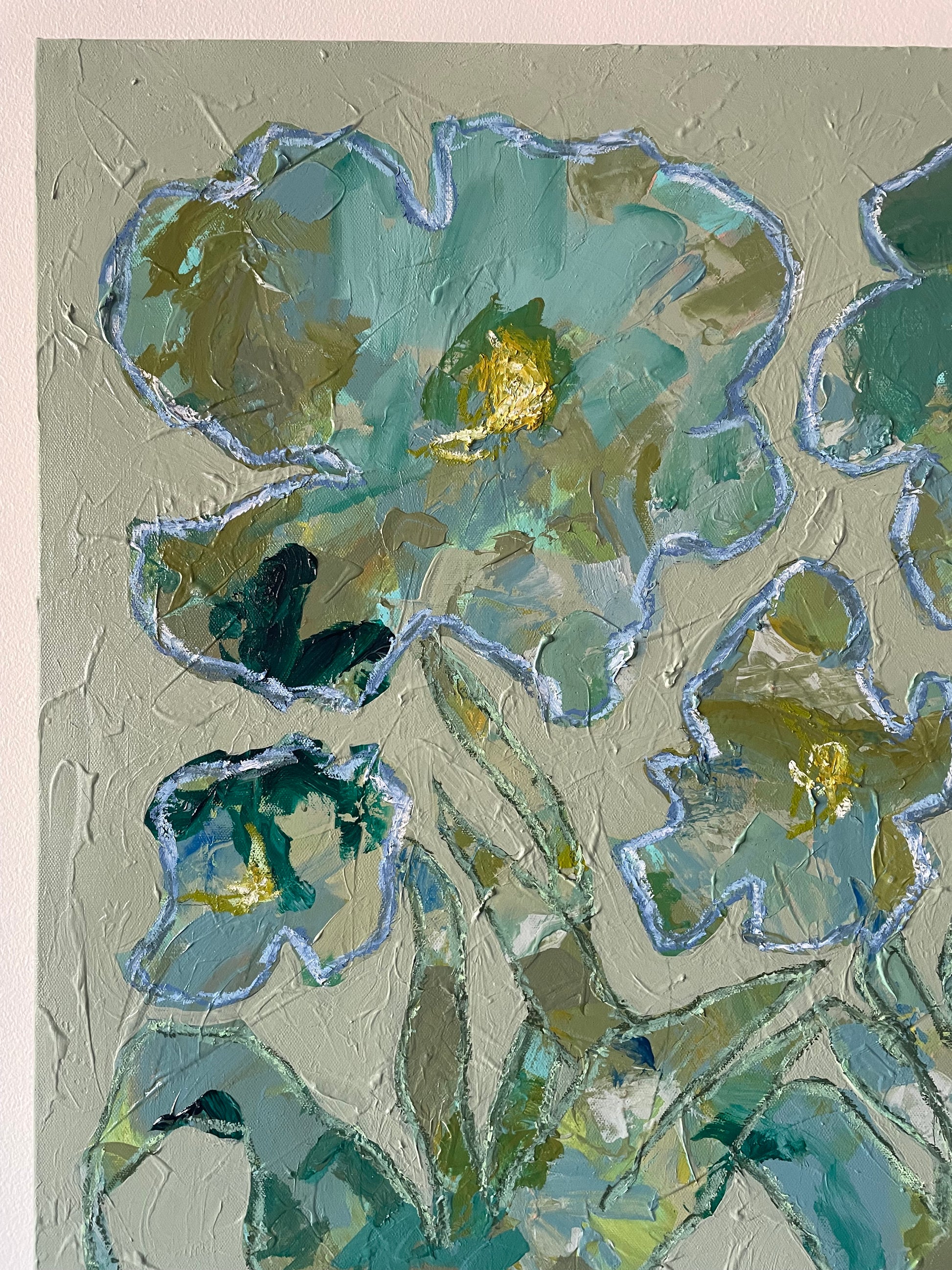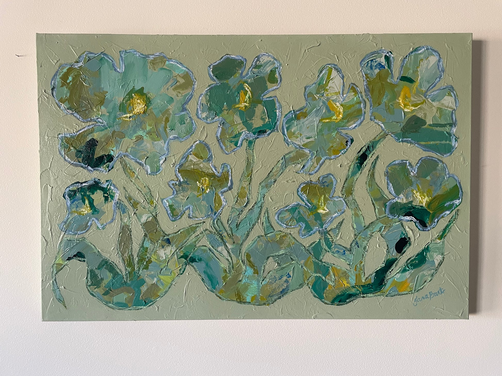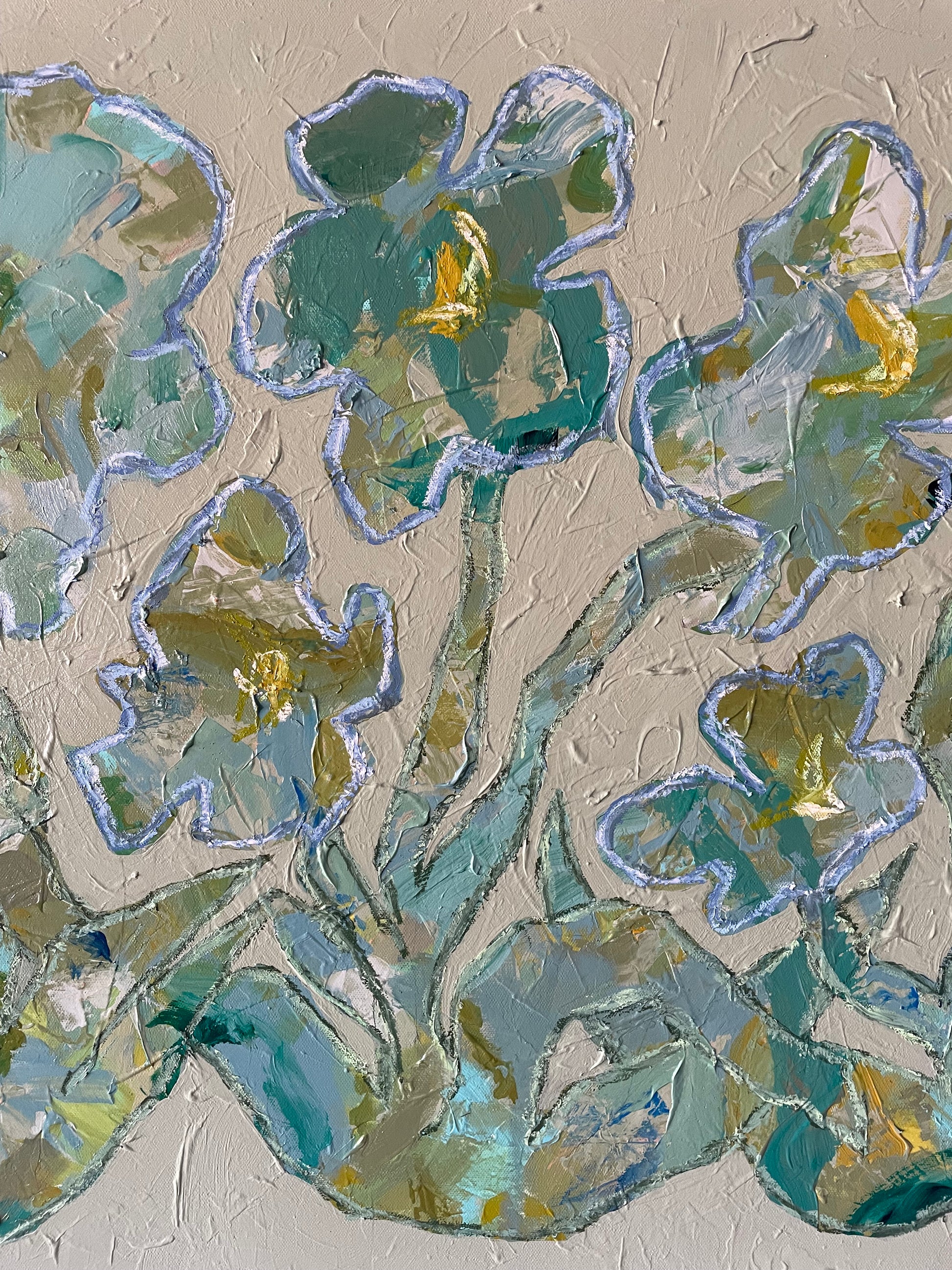 24x36 textured abstract floral painting in mixed media of acrylics and oil pastels