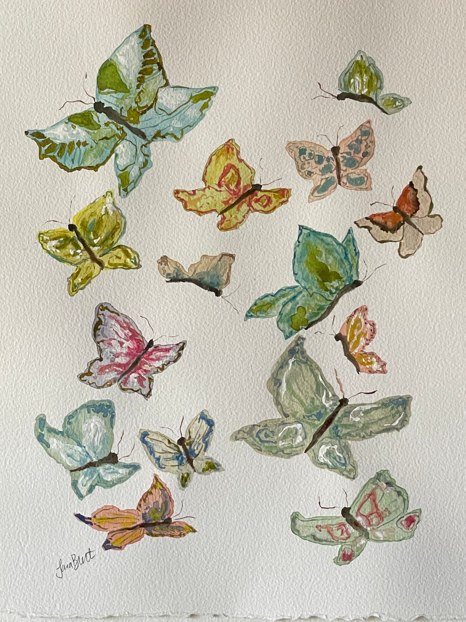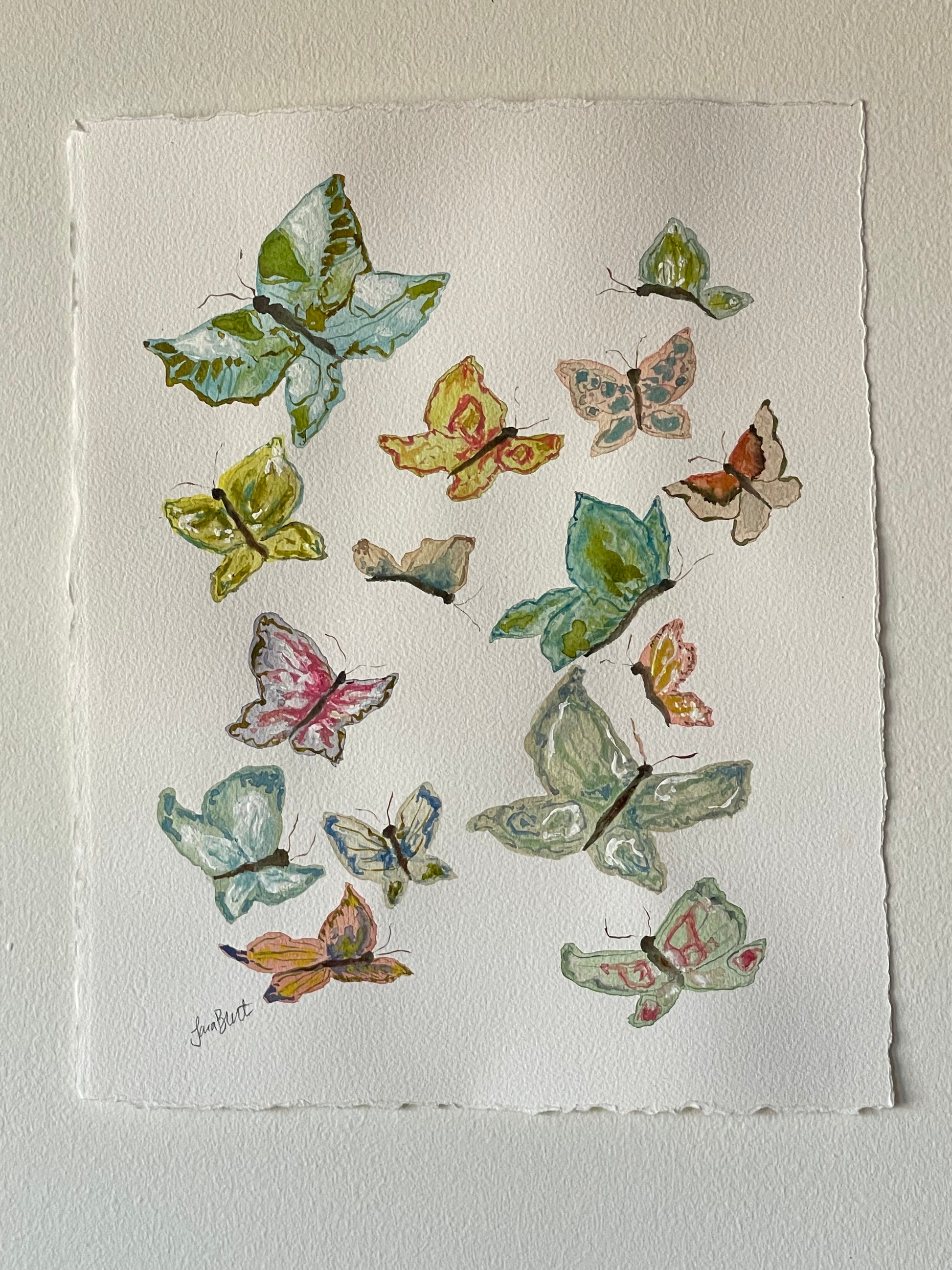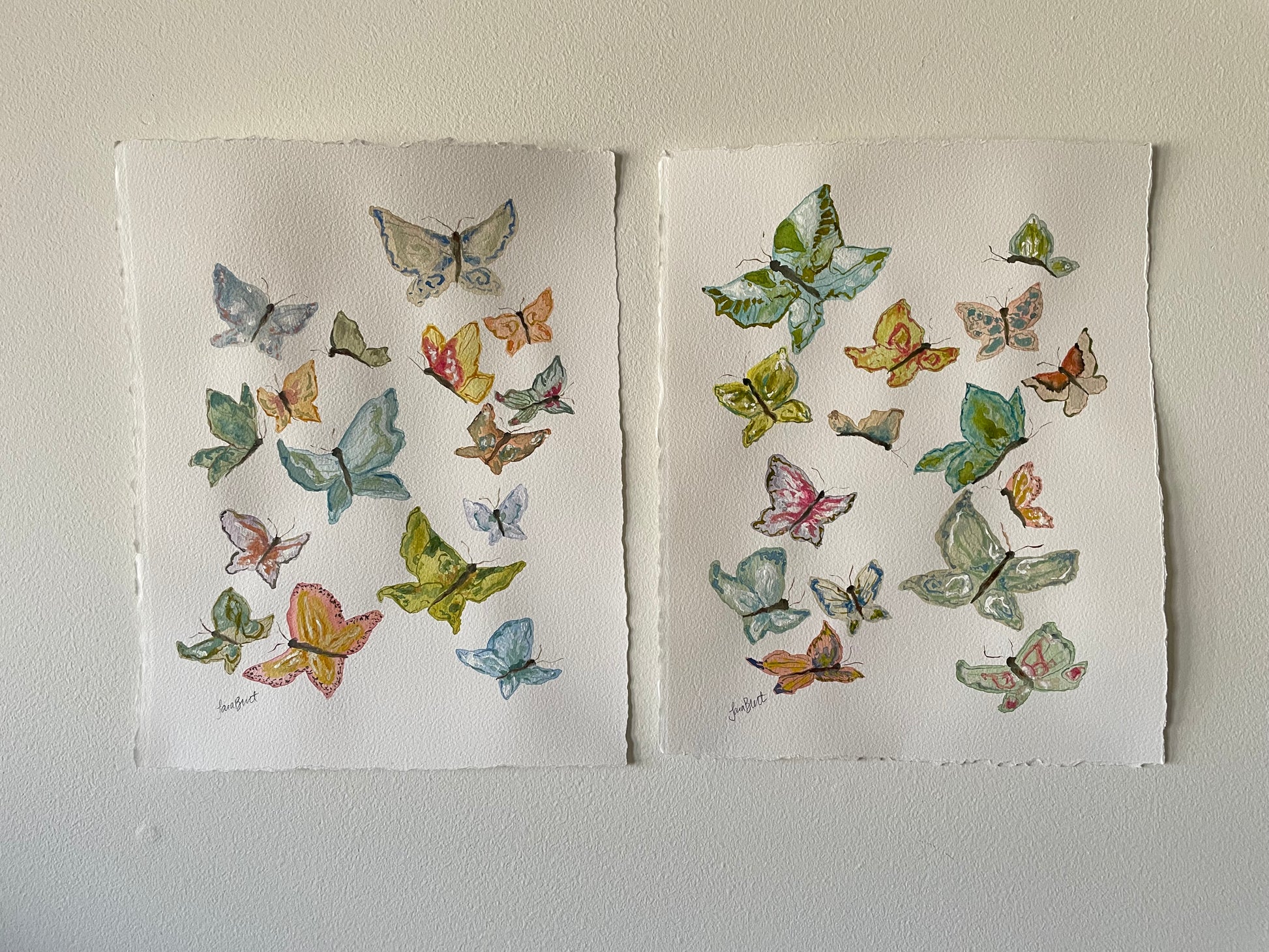 Whimsical fluttering butterflies on hand deckled cotton paper in watercolor and gouache mediums