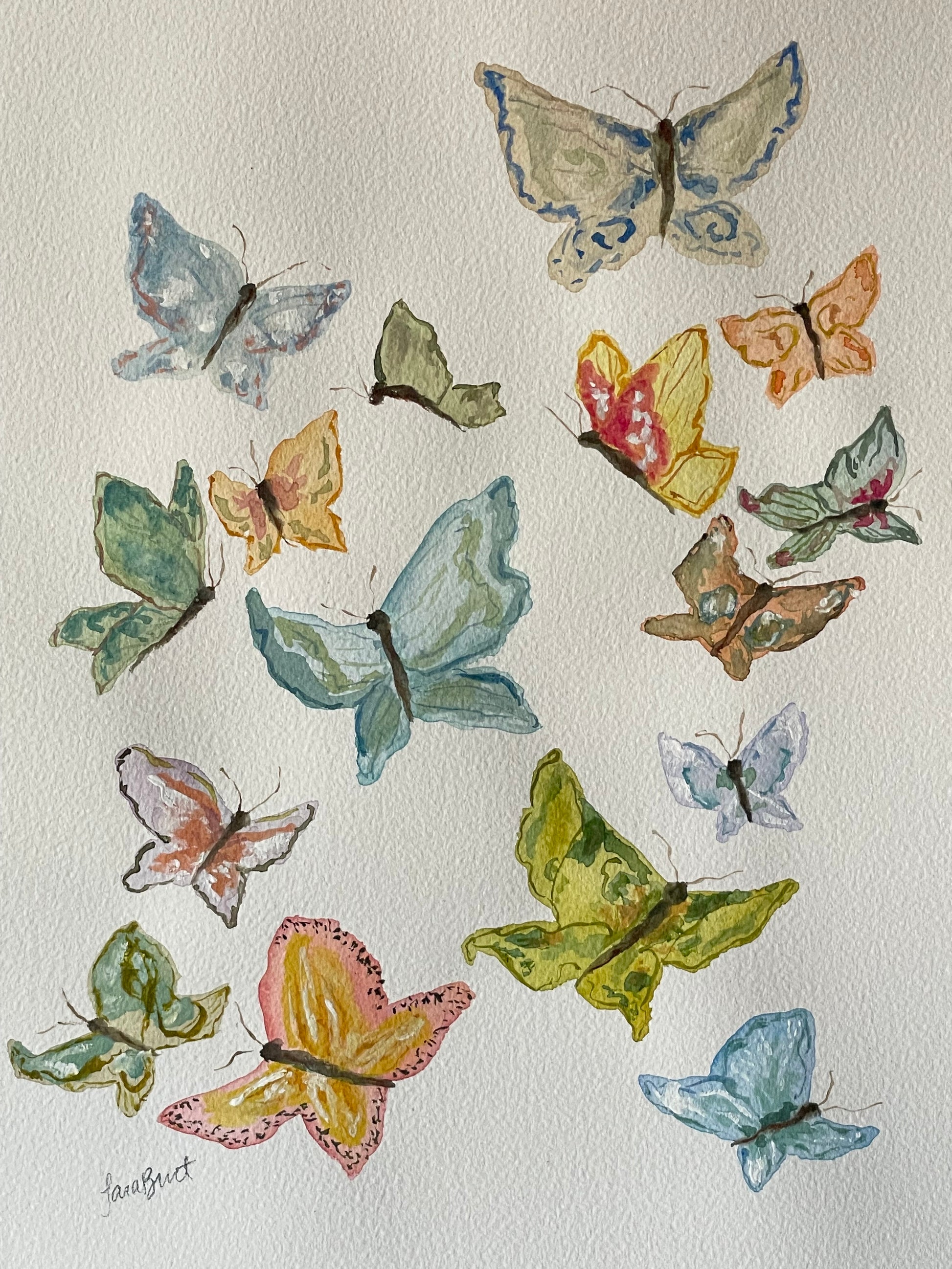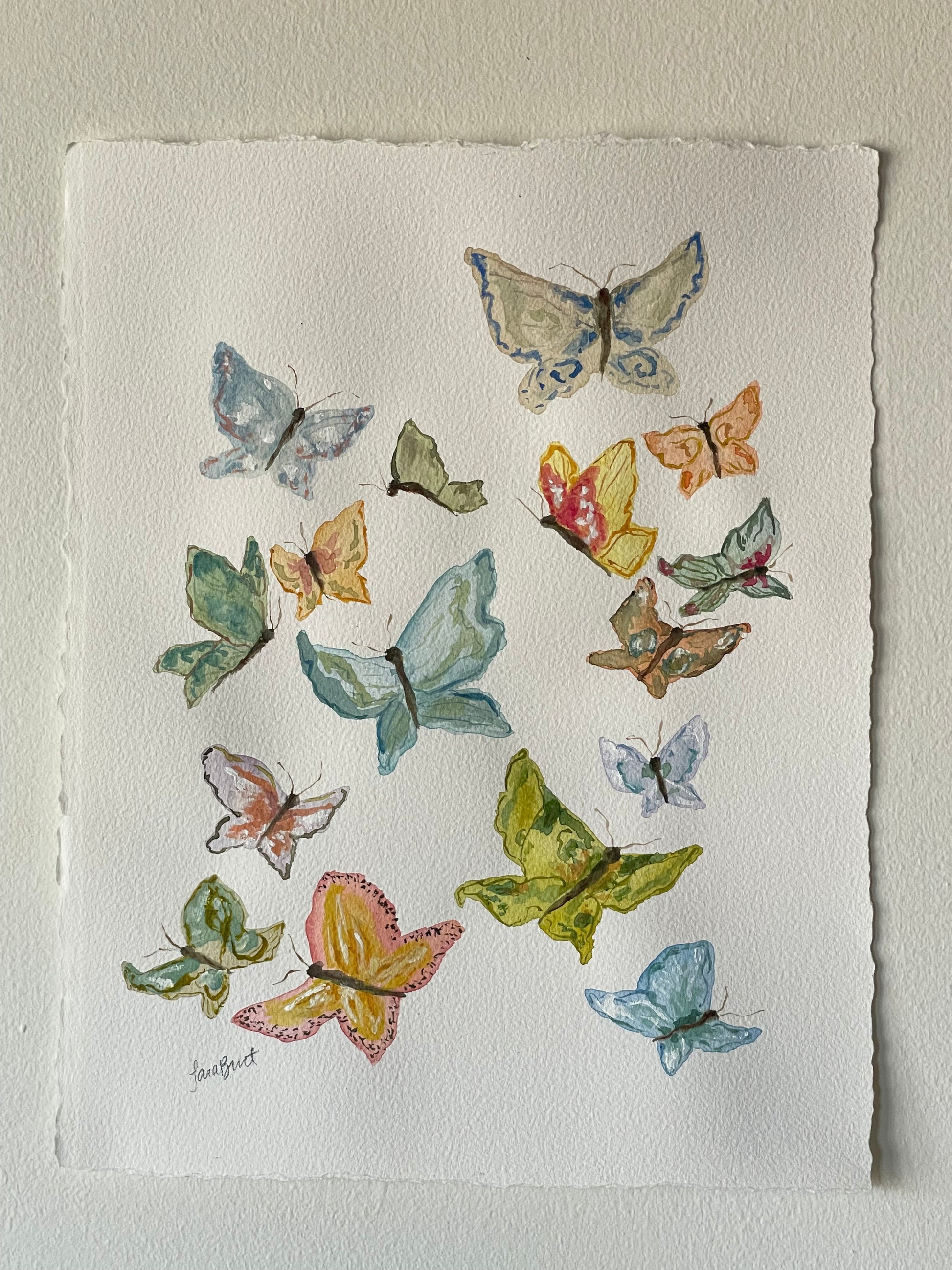 Whimsical fluttering butterflies on hand deckled cotton paper in watercolor and gouache mediums