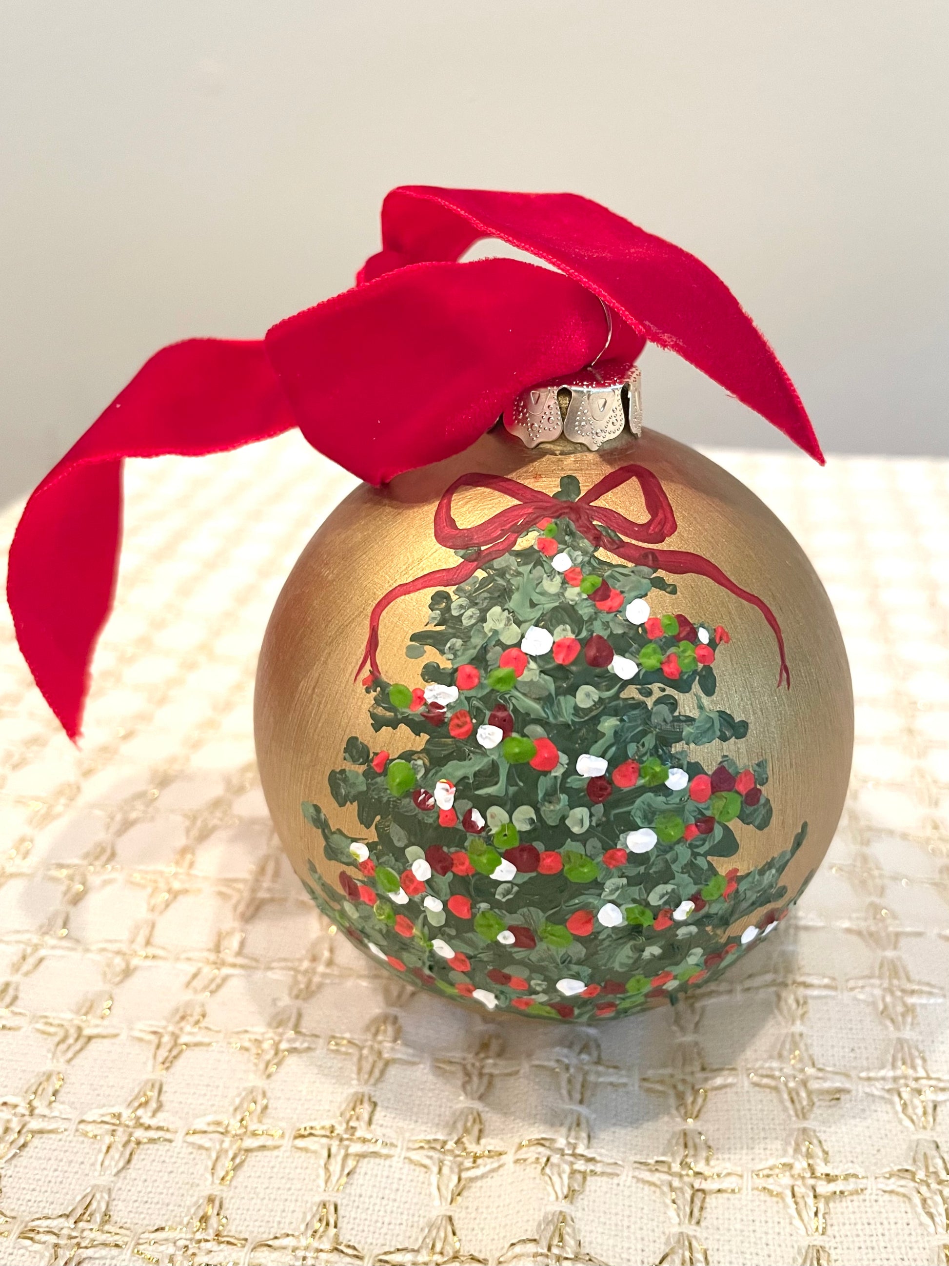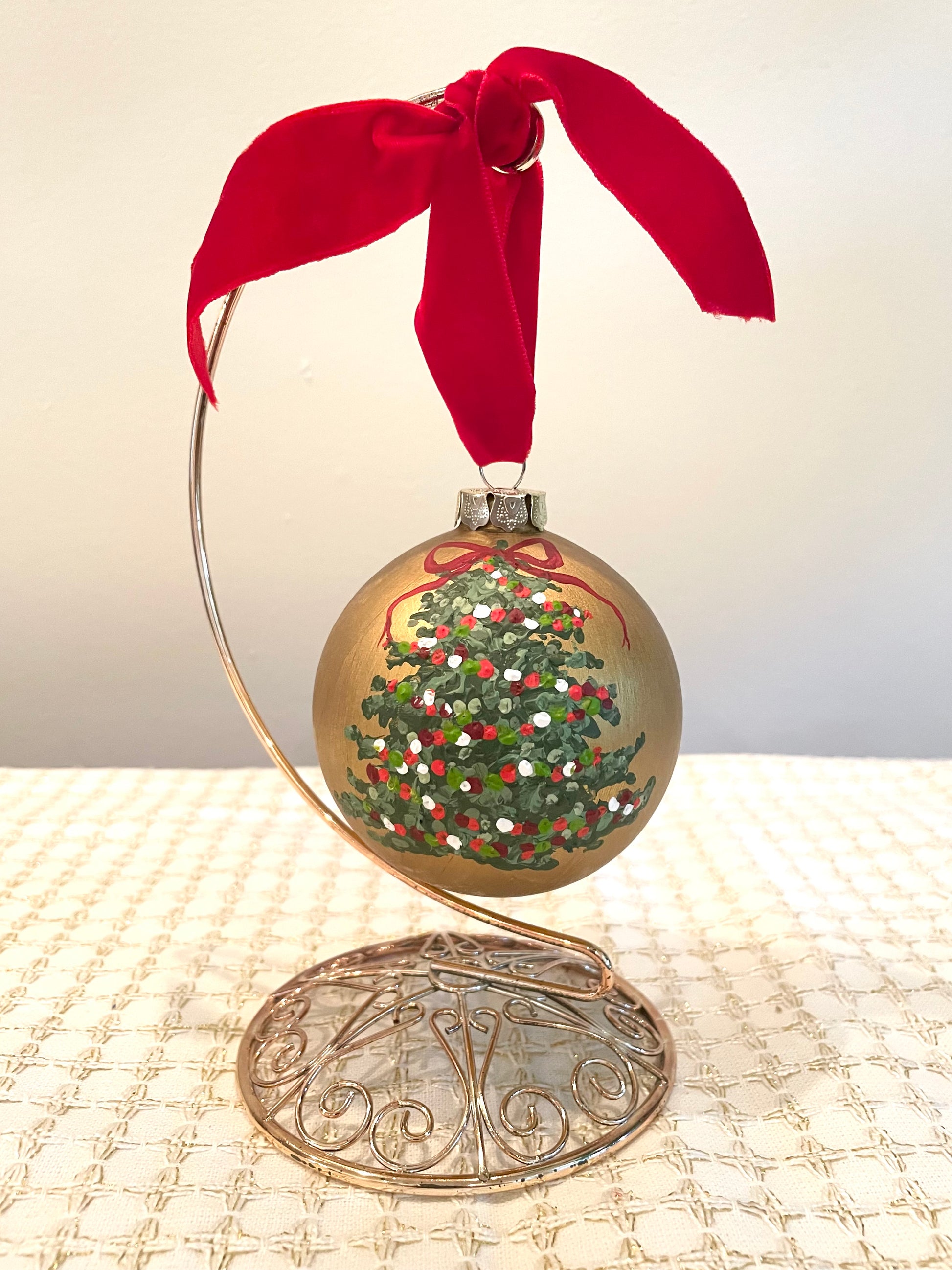 Hand painted signature pointillism tree with bright reds, lime, white, and gold on gold ceramic ornament