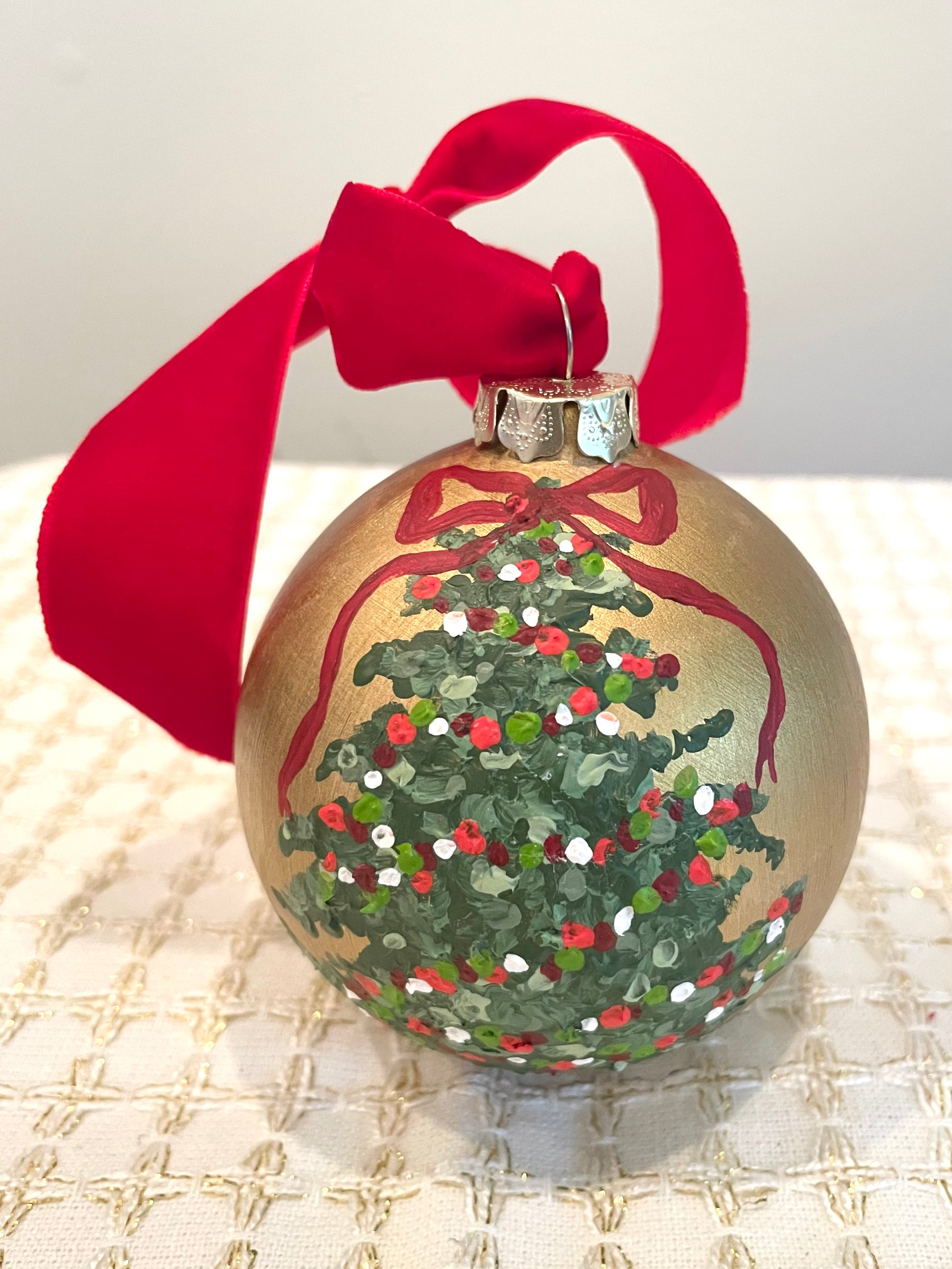 Hand painted signature pointillism tree with bright reds, lime, white, and gold on gold ceramic ornament