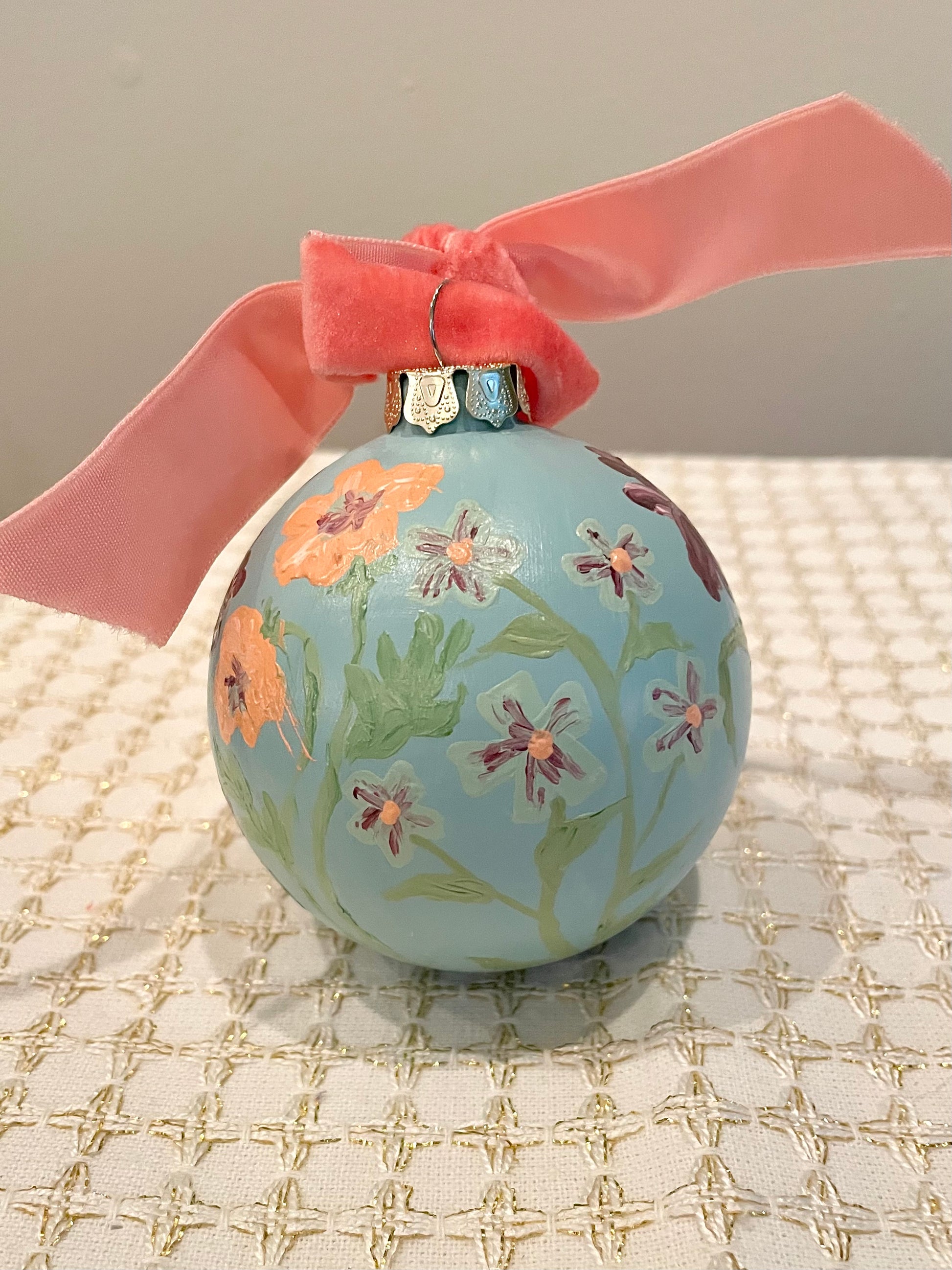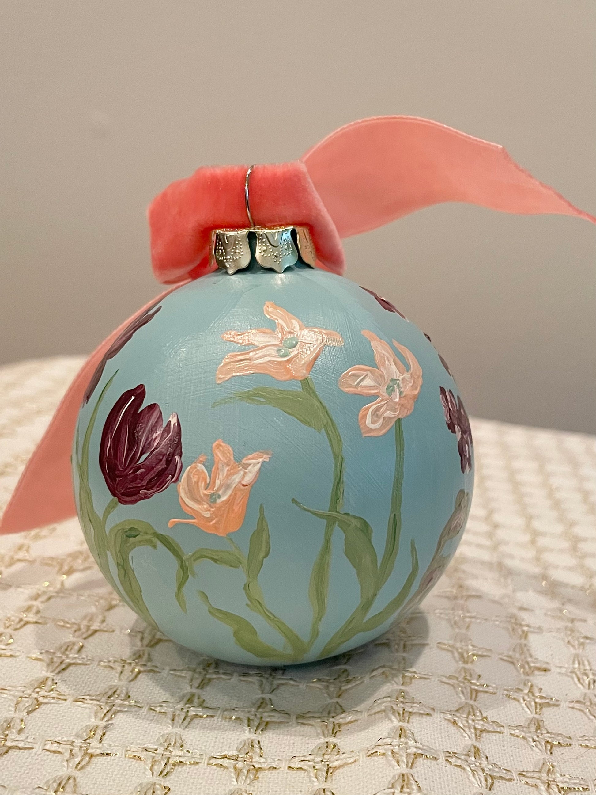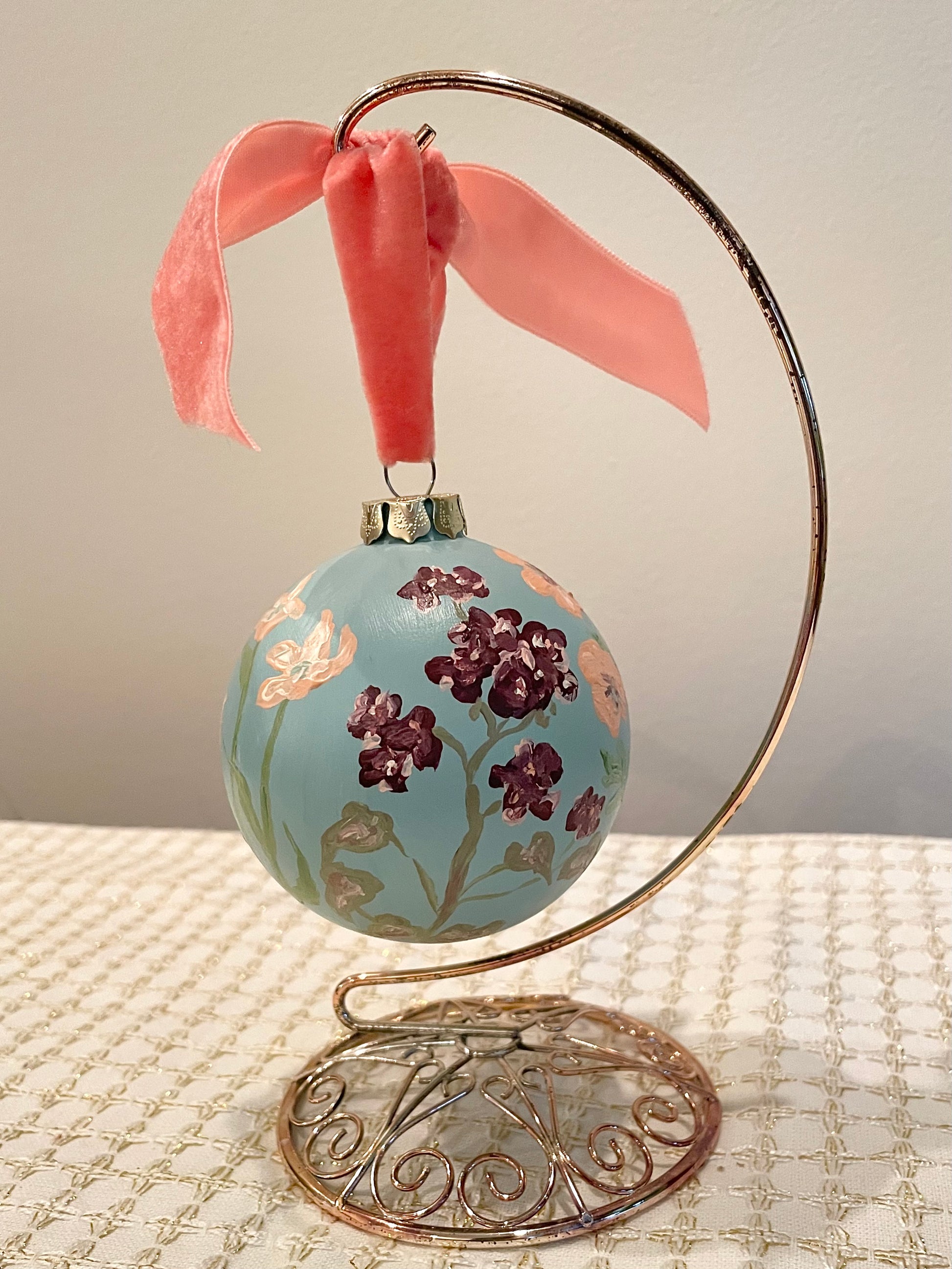 Hand Painted florals in plum purples and corals on a soft aqua blue ceramic ornament that represents the Artist's Secret Garden style paintings